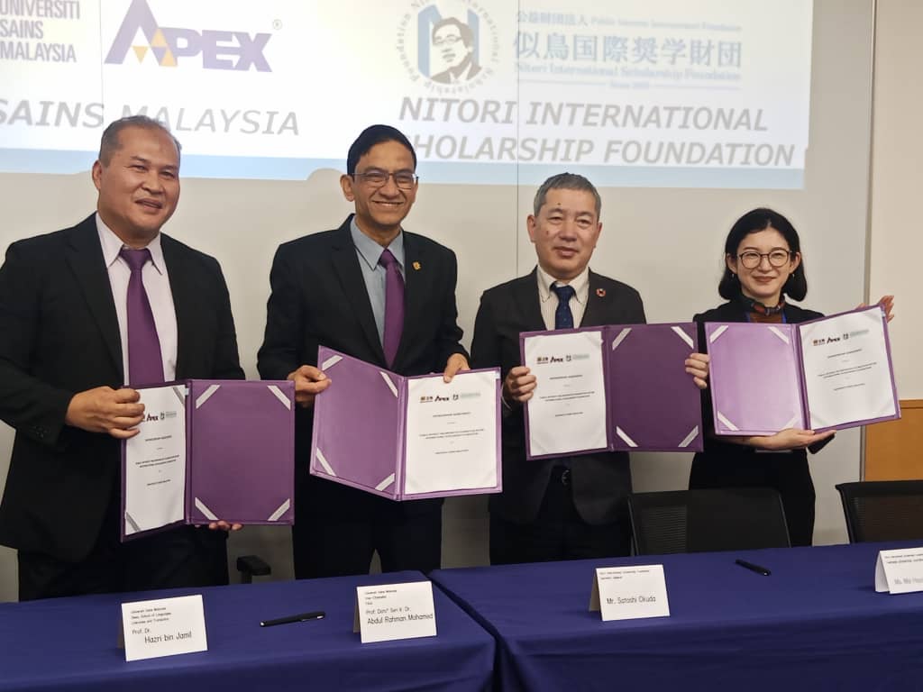 日本东京,2025 年 11 月 10 日 —— 马来西亚理科大学( Universiti Sains Malaysia, USM )与似鸟国际奖学金基金会( NITORI International Scholarship Foundation )今日在日本东京似鸟集团( NITORI )总部举行合作备忘录( Memorandum of Agreement, MoA )签署仪式,正式缔结战略合作伙伴关系。